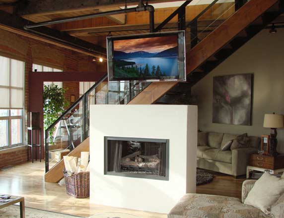 The client wanted a solution that would allow the television to hang above the custom contemporary fireplace with a solution that was rustic yet structurally proven and be able to route the cabling. We used plumbing pipe which looked the part, is very strong and was relatively inexpensive.